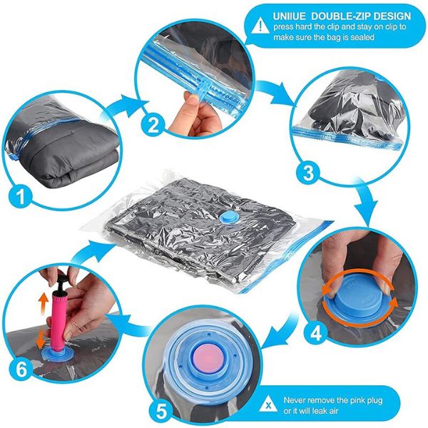 Deze vacuüm-verzegelde zakken zijn perfect voor op vakantie omdat je de lucht er gemakkelijk handmatig uit kunt halen en omdat ze door hun compacte formaat gemakkelijk mee te nemen zijn.