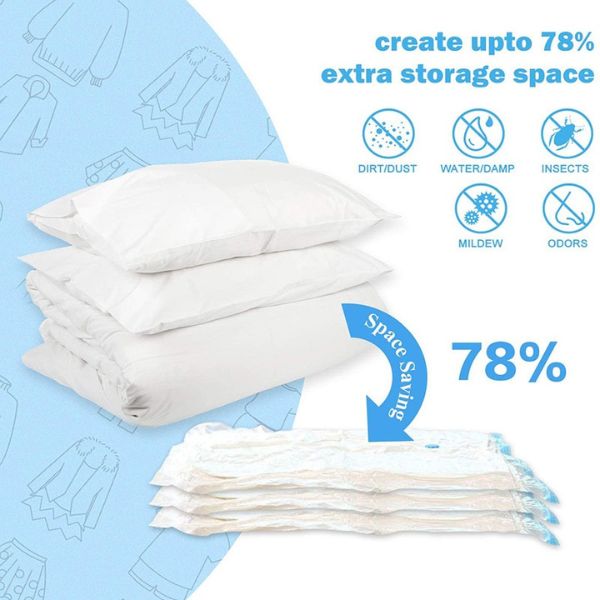 Je kunt tot 80% ruimte besparen met vacuümzakken die ideaal zijn voor al je opbergbehoeften. Na het sluiten kunnen ze gemakkelijk worden opgeborgen onder het bed, op de plank of onder de kast.