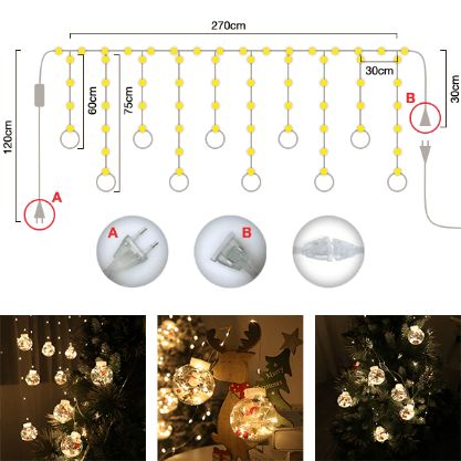 De decoratie met lichtgevende ballen heeft de vorm van een gordijn. Als je ze ophangt, creëer je een echt kerstsprookje