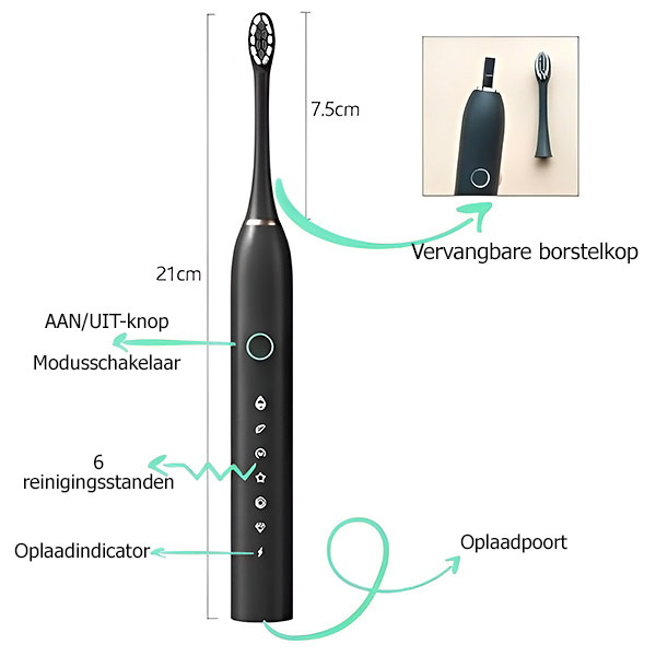 🦷 De mogelijkheid om vervangende opzetborstels te kopen voor langer gebruik en volledige hygiëne!