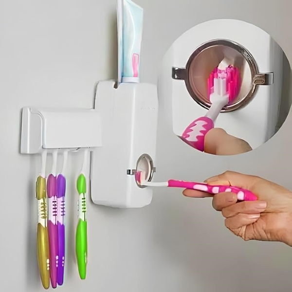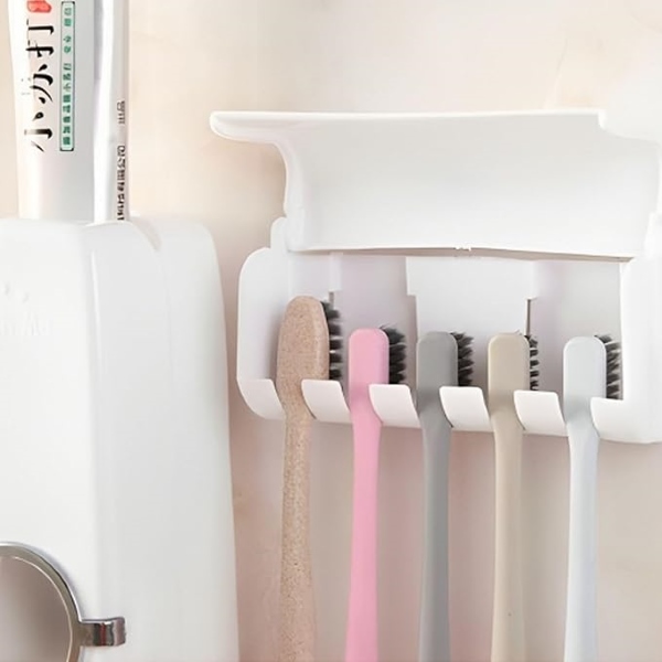 Orden rommelige badkamertafels met onze alles-in-één zelfklevende tandpastadispenser en tandenborstelhouder set die plaats biedt aan 5 borstels. Dispenseer de perfecte hoeveelheid tandpasta terwijl je tandenborstels droog en hygiënisch blijven!